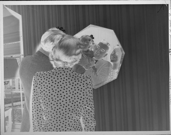 Editor: This photograph, "Untitled (man looking in woman's ear inside medical trailer)" by Martin Schweig, feels incredibly intimate, almost invasive. What cultural narratives do you think are at play here? Curator: The ear, a symbol of listening and understanding, becomes a focal point. Consider the doctor’s focused gaze versus the woman’s passive acceptance. Does this visual dynamic reflect a power imbalance inherent in medical encounters, or perhaps a deeper cultural expectation of female obedience? Editor: That's insightful. So the act of looking in the ear isn't just medical, it's symbolic? Curator: Precisely. The photograph captures a moment laden with cultural weight. How do we reconcile this image with contemporary discussions around patient autonomy and informed consent? Editor: I hadn't considered that. It gives me a lot to think about in terms of shifting social dynamics. Curator: Indeed. Art invites us to re-evaluate our understanding of the past, and our expectations for the future.