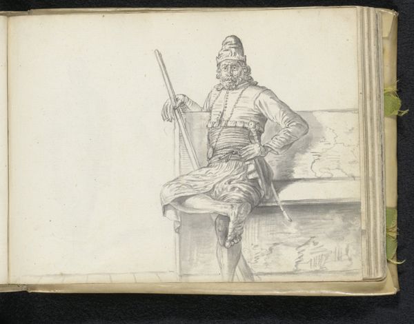 Esaias Boursse sketched these Two Sinhalese Soldiers with graphite on paper sometime in the mid-17th century. Graphite, a relatively soft and readily available material, allowed Boursse to capture the likeness and detail of his subjects efficiently. Notice how the quality of the graphite lines varies. Boursse uses delicate, thin strokes to define the figures' features and clothing, while broader, shaded areas create volume and depth. The paper, likely a common writing or sketching material at the time, bears the marks of the artist's hand, with slight imperfections and variations in texture that add to the drawing's intimacy. Consider the social context, as Boursse was a Dutch artist working for the Dutch East India Company, which held sway in Ceylon, now Sri Lanka. The drawing is not merely an objective record, but evidence of European colonial expansion and its complicated legacy. Looking at the material and the making of this drawing gives us insight into the complexities of cross-cultural exchange and representation during the age of exploration and trade.