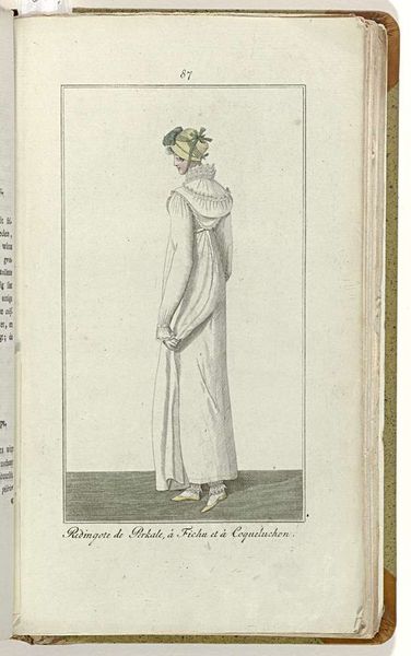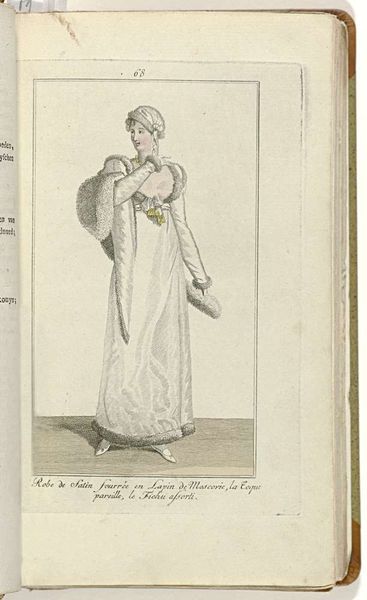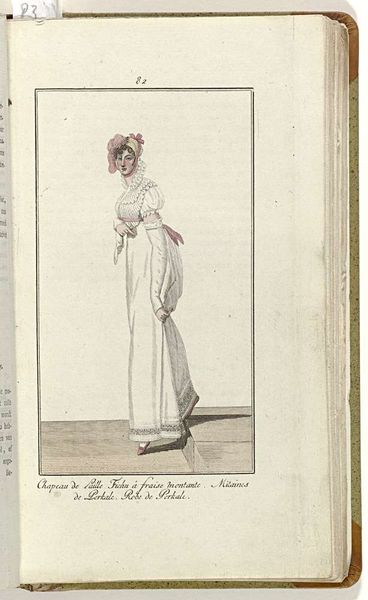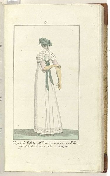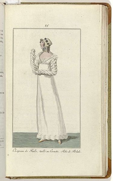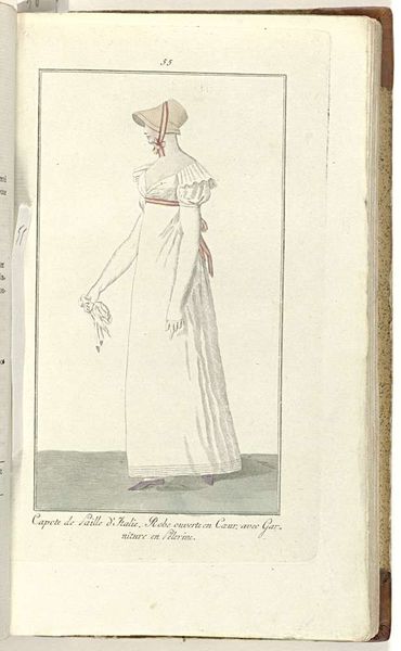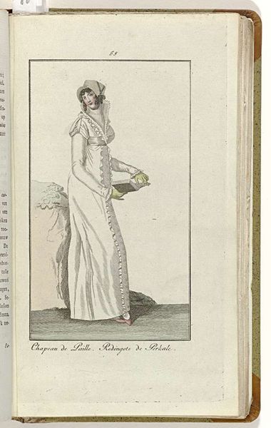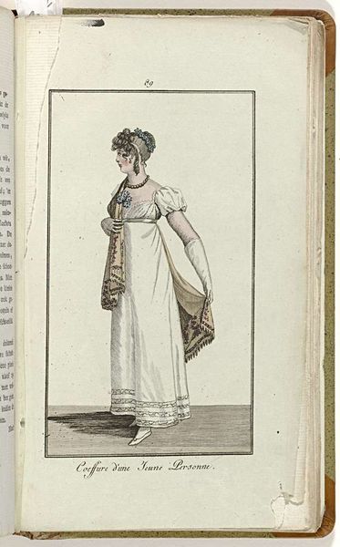 Editor: This is a fascinating print! Titled "Elegantia, of tijdschrift van mode, luxe en smaak voor dames," from June 1809. It’s a combination of etching and ink on paper. What I immediately notice is the focus on the figure, yet there’s a flatness, like a paper doll showcasing an ideal. What do you see in this work? Curator: This print speaks volumes about the societal constraints placed upon women of the era. Consider the title itself – elegance, luxury, taste, all directed ‘for ladies’. It presents a prescriptive image, dictating how women should perform their gender. What does this carefully constructed image suggest to you about the role of women in 1809? Editor: It’s like a manual for being a woman, focusing on external appearance and status. The way she carries herself feels very deliberate. Curator: Exactly! This 'genre painting,' though miniature and seemingly innocuous, participates in a broader narrative about class, aspiration, and the performative aspects of femininity. Notice the high-waisted dress, the delicate shawl - all signifiers of wealth and social standing, yes? And whose standards are being used to determine status? Editor: It's intriguing how something so seemingly simple reflects complex social structures. Do you think the artist was aware of these deeper implications, or were they simply capturing the style of the time? Curator: Perhaps both! But even in ‘capturing the style’, they were reinforcing a particular worldview. By reproducing and circulating these images, publications like "Elegantia" actively shaped contemporary ideals of femininity, with potentially exclusionary results along lines of class and race. The very act of representation becomes a political one. What implications might the consumption of such images have? Editor: It’s made me think about the power dynamics inherent in fashion and representation. Thanks for showing me a different lens to analyze through. Curator: Indeed! Looking at fashion through a historical and social lens lets us question who dictates trends and why. There's a continuing dialogue about beauty standards and inclusivity across art history and contemporary times.