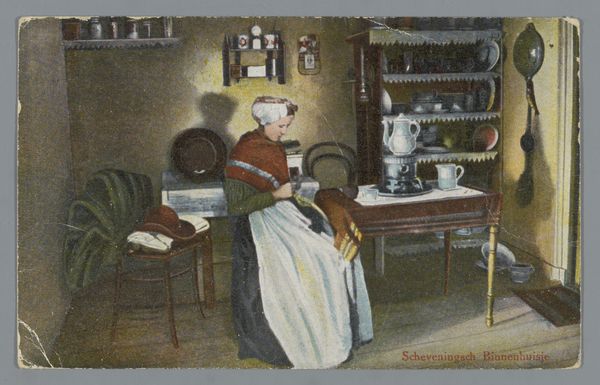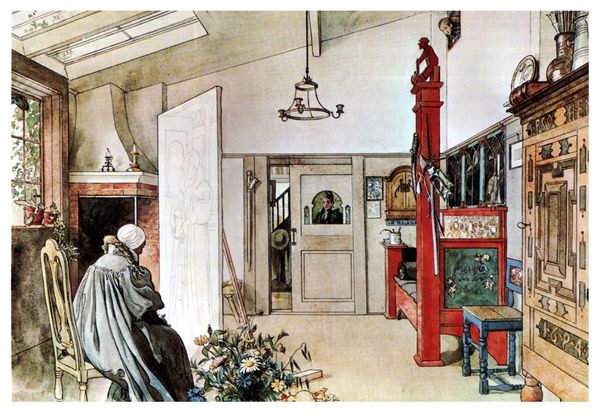 Editor: This is Carl Larsson's "Between Christmas and New Aço", from 1896. It’s a watercolor painting depicting a domestic scene. It feels very warm and intimate. What cultural narratives do you see at play here? Curator: I see a carefully constructed image of domesticity, meant to project a specific vision of Swedish identity. Consider the "Guds Fred"—"God's Peace"—inscribed over the doorway. What kind of peace do you think Larsson is promoting, and for whom? Editor: Maybe it's just a reflection of his own home life and family values. Curator: It is tempting to view Larsson’s art primarily through the lens of personal biography; however, we can investigate the potential cultural agenda embedded within. What function might genre-painting serve in late 19th century social discourse? What gender roles are highlighted? And how might ideas of nation and “home” be linked? Editor: Hmm, I suppose the painting promotes specific ideals about home, family, and Swedish culture that reinforce the period's values. It's less a neutral depiction, more of a persuasive image of how things should be. Curator: Exactly! And look closely at how the home is staged – every object carefully placed. Larsson is not just painting a scene; he's curating an ideal of Swedish comfort, tradition, and family centered around a nurturing, caregiving woman. Are we looking at an innocent celebration of home, or is it something more politically charged? Editor: It's interesting to consider the power dynamics within the scene, not just the surface level beauty. I’ll never be able to unsee the loaded historical implications of such seemingly ‘simple’ family-based scenes again! Curator: Precisely, these images shape societal views in subtle ways and they become more telling with the passing of time and societal progress. The artist wasn't working in a vacuum. He actively participated in constructing these narratives, intentionally or not. Editor: Thank you – that's definitely changed how I view this piece!