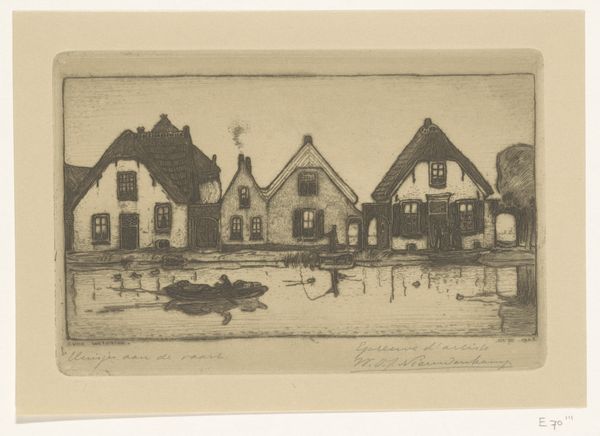 Editor: This is "Het aardige sluisje. Edam," a 1914-1916 etching by Wijnand Otto Jan Nieuwenkamp. The intricate detail in the reflections immediately caught my eye. What elements stand out to you within its composition? Curator: Note how Nieuwenkamp uses a sophisticated network of lines to create variations in texture and tone. Consider the relationship between the density of lines and the creation of depth. Where do your eyes focus and why? Editor: I'm drawn to the sharp contrast between the detailed buildings and their almost blurry reflections in the water. Is that a conscious choice, emphasizing realism or something else? Curator: Realism is too simple a term. Observe the interplay between light and shadow; the texture of the buildings and the foliage. These are not mere representations, but carefully constructed arrangements to create visual interest. Editor: So you’re suggesting the accuracy is secondary to the structural elements themselves? Curator: Precisely. Nieuwenkamp manipulates our perception through formal means. How do the geometric shapes of the buildings interact with the more organic forms of the natural world? Note, too, the placement of the horizon line. Editor: I see, by examining the contrast and formal structure, we can decode the artwork's internal dynamics and perhaps move beyond literal representation. Curator: Indeed. Art becomes more than what is pictured, it is how it is pictured. Analyzing its inherent qualities brings its true meaning to light.