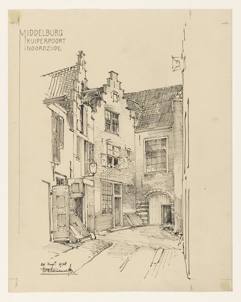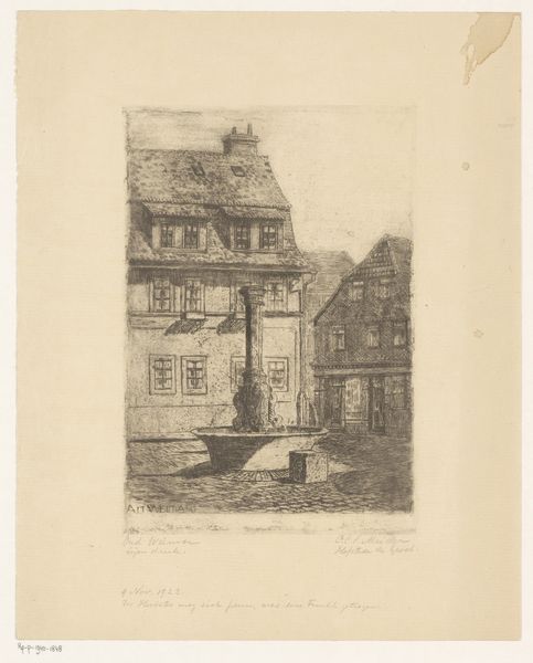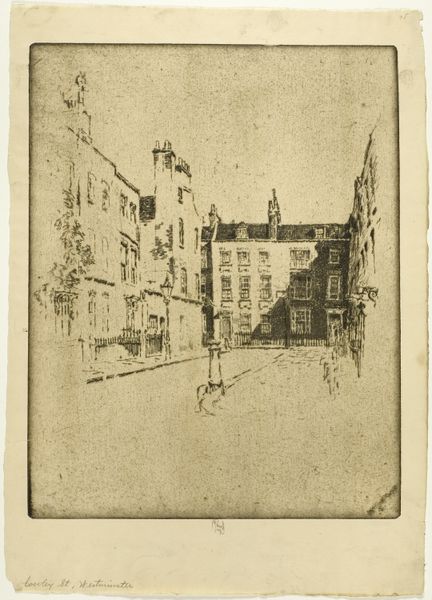 This small etching, "Straatgezicht," was crafted by Joannes van Liefland in the 19th century. The building looms large, rendered through assertive lines that dominate the composition. The artist manipulates line to create varying textures, from the solid beams of the structure to the softer tones of the overcast sky. The building's architecture appears to challenge principles of equilibrium and stability. Lines intersect and diverge, never quite conforming to conventional perspective, as though Liefland is suggesting a reality that is fragmented and complex. Consider how the artist's use of scale enhances the monumental feel of the construction, despite the artwork's small dimensions. Liefland presents us with not just a building but also a visual metaphor for the weight of history and the enduring presence of the past. In its formal properties, "Straatgezicht" invites ongoing interpretation.