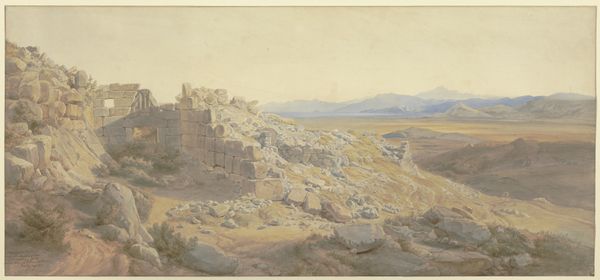 Curator: Before us, we have "Burgruine, vorn auf einer Brücke zwei Männer," a watercolor and charcoal drawing on paper housed here at the Städel Museum, created by the French artist Jean-Joseph-Bonaventure Laurens. Editor: There’s a palpable sense of melancholy. The delicate washes of watercolor create an ethereal atmosphere around this decaying castle, perched precariously on the craggy rocks. It feels almost dreamlike. Curator: Note how Laurens uses the watercolor to describe the textures. The rough, unfinished stone of the ruins, for example, and how it contrasts with the smooth expanses of the distant landscape. The use of charcoal provides that stark contrast. Editor: Exactly. It's compelling to consider the labor involved. Someone quarried these stones, shaped them, transported them up this hill – all to create a structure that's now slowly returning to the earth from whence it came. There is an incredible amount of manhours represented within this single frame. Curator: The figures on the bridge are key structural components, aren’t they? They lead the eye into the composition and add to that romantic contemplation. They’re like witnesses to time itself. Editor: Indeed, who were the men portrayed? How are we, as the viewer, implicated into that legacy, as well? And let’s not forget that materials dictate much about its survival and handling – paper is far more fragile than oil on canvas. Curator: In considering Laurens’ Romantic lens, one could read that juxtaposition of temporality as essential to the period itself – nature as sublime and powerful. Editor: From a materialist perspective, this artwork prompts us to consider the environmental context: how human endeavor interfaces and ultimately succumbs to nature’s inexorable forces, revealed over time. Curator: An apt way to consider this image as it reflects both skill and symbol. Editor: A striking interplay that enriches our viewing experience, indeed.
