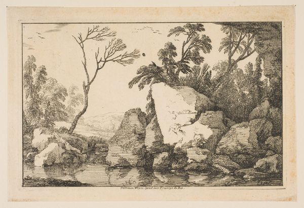 Editor: So, this is Laurent de La Hyre’s “Clump of Trees,” an etching from around 1640. It’s deceptively simple. What strikes me most is its somewhat desolate tone, especially with the stark contrast created by the etching technique. What can you tell me about it? Curator: That feeling of desolation you're picking up on is significant. We must remember that landscape art during this period wasn't simply about pretty scenery. It often served as a coded commentary on social structures, particularly in relation to land ownership and the impact of burgeoning industries on the environment. Do you notice anything particular about how nature is represented here? Is it idealized or something else? Editor: It does seem to have a certain... roughness to it. Not manicured at all, a sense of nature left to itself, maybe? Curator: Precisely! That 'roughness' becomes a form of resistance. Remember, this etching exists within a historical context where the wealthy were actively shaping landscapes for their pleasure. Hyre subtly questions this imposition. His landscapes capture the socio-political tensions present within the relationship between humanity and the natural world at the time. Do you see the ways that this connects to more contemporary ideas about climate justice or land rights? Editor: So, by depicting an unkempt landscape, La Hyre might be making a subtle statement about land and power...fascinating! Curator: Exactly! And thinking through these complex relations is how a seemingly straightforward landscape suddenly becomes rich in layered, critical meaning. These aren't just pretty pictures, but silent manifestos that critique power structures, even centuries later. Editor: I'll never look at a landscape the same way again. Curator: I hope so! And keep asking questions like these. This artwork, as are so many, is waiting for you.
