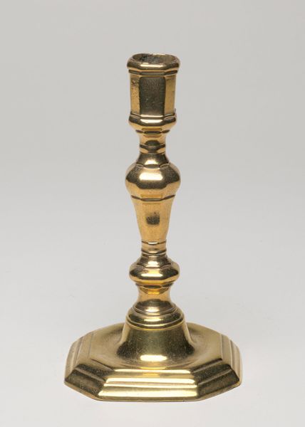 Editor: This beautiful, anonymously crafted candlestick, likely dating to the 17th century, employs brass metalwork in the Baroque style, and currently resides in the Minneapolis Institute of Art. It's…striking, somehow both sturdy and delicate. What's your take on it? Curator: Well, first off, you’ve got to imagine the play of light and shadow it would have cast! Back then, candlelight wasn't just illumination; it was ambiance, mood, magic, a stark contrast to the overwhelming artificial lights we’re used to. This isn't just a functional object; it's a tiny sculpture meant to transform a space and evoke something beyond mere visibility. It speaks of both everyday practicality and special, sacred moments. How do you respond to its material presence? Editor: The metal definitely feels…durable. Like it’s survived quite a lot of history. Curator: Absolutely! Baroque art, even in something as "minor" as a candlestick, loved ornamentation and drama. This piece showcases that impulse, translated into everyday life. Imagine the hands that polished it, the stories it has silently witnessed. What emotions do you think an object like this would carry from centuries of use? Editor: A sort of quiet strength? Resilience? I definitely see the "drama" in the tiered design now that you point it out. So, more than just a functional object... a cultural artifact, loaded with significance? Curator: Precisely! These pieces teach us as much about the past and the people who lived in it as the "high art" objects we are supposed to focus on. Editor: This has shifted my perception; I'm definitely seeing candlesticks with new eyes now. Curator: Excellent! Next time you see an everyday object, ask yourself, what untold stories does it conceal?