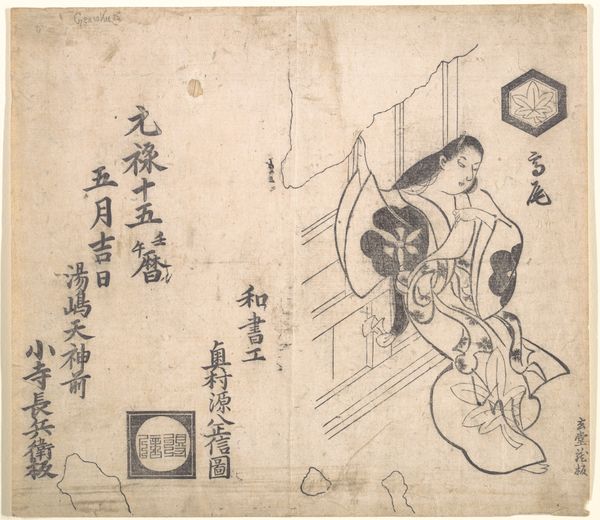 Curator: What strikes me first is the almost playful simplicity of line in this image. Editor: I completely agree. The overall effect is very endearing—sort of like a rough sketch filled with tender affection. Curator: Well, let’s provide some context. We're looking at a page from "Suiseki Picture Album" – *Suiseki gafu* – created by Satō Suiseki in 1814. It’s a drawing rendered in ink on paper. Editor: Satō, hmm… That name whispers secrets. Does "Suiseki" have significance in his artistic name? Curator: Absolutely! "Suiseki" refers to miniature stones valued for their suggestive resemblances to natural landscapes. Editor: Oh, brilliant. Like finding worlds within ordinary rocks, mirroring his ability to evoke volumes of emotions with such sparing lines. This ukiyo-e, though seemingly simple, suggests the heavy lifting of daily life. Is there a story that tradition might associate with this particular composition? Curator: The images in this album primarily depict everyday figures and scenes rendered with light, swift strokes. The weight this vendor carries seems significant, underscoring both a physical and cultural weight on the backs of ordinary citizens, which invites speculation. Editor: I see. This evokes thoughts about burdens and dependence – the boy clinging to the vendor for support and perhaps sustenance. It suggests a bond built on reliance. I find the bold strokes around the vendor's figure gives him volume, making his role in the composition primary. Curator: That reliance is captured skillfully with very minimal, intentional use of ink lines. This exemplifies a visual continuity of familiar and archetypal images— a cultural memory persisting through time. What looks almost naive actually operates on sophisticated cultural levels, showing just how universal such dynamics can be. Editor: And so simply told! These fleeting impressions etched in ink. There's a kind of melancholic beauty woven into their everyday struggle; wouldn't you agree? Curator: Absolutely, which really makes one reflect on the long tradition and symbolism encapsulated in what appear to be quite simple images. Editor: It gives me cause to appreciate what lies hidden in plain sight, doesn’t it?