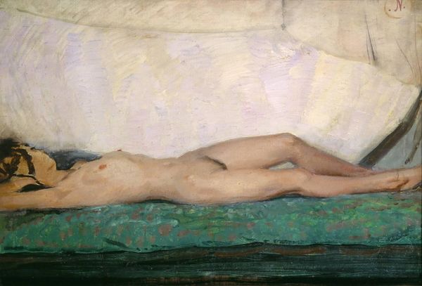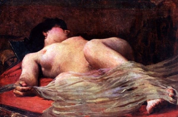 Here is a painting by Pierre-Auguste Renoir titled “Large Nude.” The canvas offers a study in contrasts, primarily through its delicate handling of light and texture. The artist's use of soft, diffused light across the woman's body creates an intimate and tactile experience, drawing the eye to the undulating curves and subtle gradations of her skin. Consider Renoir's approach to form here. The figure is not defined by sharp, precise lines but rather emerges from a series of gentle brushstrokes and muted color palettes. The nude subject is set against a backdrop of loosely painted fabrics and cushions, blurring the distinction between the figure and its environment. In doing so, Renoir challenges academic conventions of representation, prioritizing sensation and visual experience over strict anatomical accuracy. The artwork invites us to reconsider traditional notions of beauty and representation. Through the materiality of paint and the sensuality of form, it creates a moment of fleeting, atmospheric beauty.