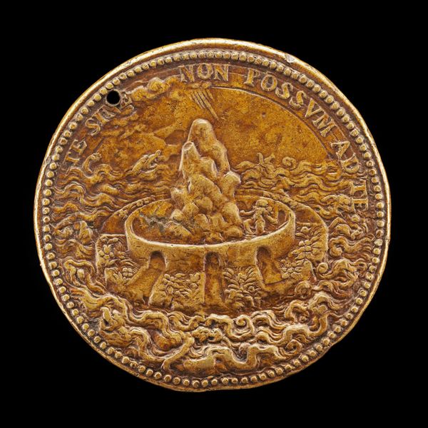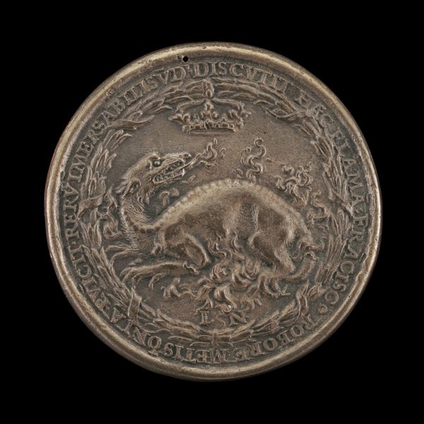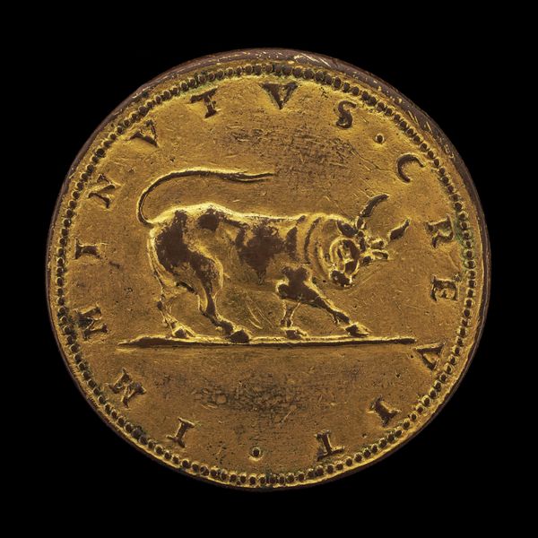 Curator: This intriguing bronze relief is "Capricorn and Stars," crafted around 1537 by Domenico di Polo de' Vetri. It presents an allegorical representation in the form of a medal. Editor: Right, allegorical, got it. My first thought, though? That little goat looks like it's about to leap off the edge of the world. Curator: It's a potent image, rendered in the exacting method typical of Renaissance bronze work. Consider the mold-making, the lost wax casting technique...the sheer labor involved in achieving that level of detail. Editor: Oh, absolutely, the process. I can almost smell the hot metal, see the artisan hunched over it. But still... there's this almost frantic energy radiating from that creature, set against the quiet certainty of the stars. Does it have to do with that circular inscription, almost trapping it inside? Curator: The inscription, indeed, offers clues. It seems to allude to fate, trust, and awareness, possibly tied to astrological beliefs of the time. These medals functioned as markers of identity, circulating within elite social circles. Editor: So it’s about understanding one’s fate, finding assurance despite destiny nipping at your heels? Because this feels more profound than just a pretty astrological trinket. It is also interesting that it doesn't resemble other portraits of the period. It almost looks like a political statement on a coin. Curator: Certainly, such objects would have carried socio-political weight, operating within networks of patronage and exchange. Medals provided ways of self-fashioning. This highlights the intersection of artistry, materials, and human interaction. Editor: Okay, thinking of it as a message in metal really clicks, though. That image becomes so potent, such a concentrated expression of yearning and self-knowledge...almost a prayer. And I bet people at the time interpreted it quite personally depending on how life treated them. Curator: Precisely. Reflecting on the original owner now...their experiences, the tactile connection they would have had to this object daily… it opens a window onto another era. Editor: Indeed. Considering both artistry and how such a thing traveled around and affected those who carried it with them makes you wonder of your own path to knowing. It's like carrying your stars and your goat on your person, ready to leap.