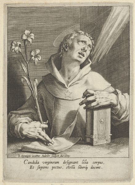 Editor: Here we have Egbert van Panderen’s "Evangelist Johannes," an engraving dating sometime between 1590 and 1637. The detail is remarkable; you can almost feel the texture of the paper and the ink. What stands out to you in terms of the material aspects of this print? Curator: The choice of engraving, a process demanding skilled labor and specialized tools, already tells us something. Each line is carefully etched, revealing a deliberate engagement with the material world. Consider the social context: prints like these made images accessible to a wider audience beyond the wealthy elite, democratizing religious iconography through reproducible formats. The labour involved and access it granted reshaped art consumption in that time. Editor: That's fascinating! So, you're saying the medium itself contributes to the artwork's message and meaning. What about the composition? I see St. John writing, with an eagle, his symbol, looking on. Curator: Precisely! The composition directs our attention to the act of writing, to the *making* of the scripture. Ask yourself, where did Van Panderen acquire his tools? Who were the artisans producing the paper? How were these prints distributed and consumed? Focusing on these material realities opens up deeper avenues for interpretation. Editor: It makes me rethink how I view prints of this era; not just copies, but active participants in shaping religious and cultural landscapes. Thanks! Curator: Indeed. By understanding the material processes behind "Evangelist Johannes", we gain insight not just into art production but into the wider social and economic dynamics of the time. It allows a deeper reflection and more thoughtful engagement.