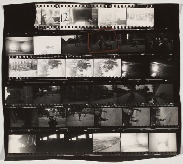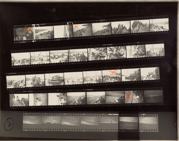 Editor: This is "On ship—New York to Paris A," a gelatin silver print by Robert Frank, taken in 1949. Seeing the contact sheet like this gives me a strong sense of voyeurism; it's like I'm flipping through someone's memories. What do you see in this piece beyond the literal depiction of a transatlantic voyage? Curator: Well, let's consider the context. This was a time of significant global upheaval and displacement following World War II. Frank, himself an immigrant, was acutely aware of social inequalities and the search for identity. These snippets, these almost cinematic frames, aren't just about travel; they’re about the journey of life itself. What about the composition strikes you? Editor: I noticed how the juxtaposition of images is almost random. Some are seascapes, others urban scenes, and then glimpses of faces, blurring the line between interior and exterior. Is this a deliberate choice? Curator: Absolutely. Frank challenges the conventions of traditional photography. It is important to situate his artwork within Post-War American society and the rise of a visual culture critiquing power structures. The apparent randomness mirrors the chaotic and fragmented experience of modern life, particularly for those navigating displacement and cultural identity. The contact sheet form amplifies this, making the process visible and highlighting the artist’s subjective choices. What do you make of the human presence, or absence, within these frames? Editor: It feels very lonely. Even when people are visible, they seem isolated, lost in thought. It could represent how uprooting oneself from the familiar makes one feel lost in transition and new beginnings. Curator: Precisely. Frank's work is a powerful commentary on the human condition in a rapidly changing world, and on navigating new landscapes. His choices make these individual stories emblematic of broader experiences of alienation, resilience, and the search for meaning after immense social trauma. I've not thought about his approach to alienation this way before. Editor: Right? I’ll definitely be looking at Frank's photography with new eyes.