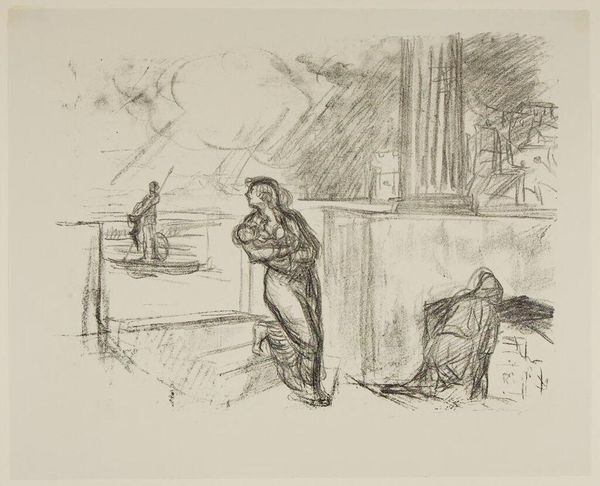Editor: Here we have “Amoureux Sur Un Banc,” or “Lovers on a Bench,” an etching by Théophile Alexandre Steinlen, created around 1902. There's a melancholic, romantic air about it, with this couple embracing in a park at night. What do you see in this piece? Curator: For me, this image speaks volumes about the lived realities of early 20th-century urban life, particularly for the working class in cities like Paris. Consider Steinlen's association with the anarchist journal *Le Chambard*. Do you notice how the figures are depicted? Editor: They're not idealized, definitely. They look like everyday people, and the setting seems gritty, not glamorous. Curator: Exactly! It challenges the romanticized visions of love often found in art. Also note the gas lamps casting long shadows; these are not just aesthetic choices. They subtly point towards issues of public space, surveillance, and the limited availability of leisure spots for certain demographics. Think about who had access to safe, well-lit public spaces. Editor: So, it's a commentary on social inequality and who gets to experience love and intimacy in public? Curator: Precisely. And consider Steinlen’s focus on marginalized communities. It's likely the couple's embrace serves as a small act of defiance, reclaiming a moment of tenderness amidst potentially hostile conditions. What kind of dialogue is this creating with Impressionist painters like Renoir? Editor: That's so interesting! I was initially drawn to the romance of it, but I see how Steinlen's actually highlighting societal issues. Thanks, it’s a great counterpoint! Curator: My pleasure, hopefully the nuance makes an impact!