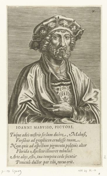 Editor: Here we have Jacobus Harrewijn's "Portret van Theuderik I," an engraving from sometime between 1682 and 1730, held here at the Rijksmuseum. It feels very formal, yet almost mocking somehow. What symbols are jumping out at you in this image? Curator: The very act of portraying Theuderic I centuries after his reign is ripe with meaning. His image is deliberately constructed, referencing the visual language of power—the crown, the inscription proclaiming his royalty. But do you notice how the pen work renders his features? There's a certain coarseness, almost a caricature. Editor: Yes! It's like the artist is undermining the very idea of "king." Why use that technique on someone from so long ago? Curator: Precisely. Consider what this imagery evokes in the viewer: history, power, legacy...but also a critical distance. This image isn't just presenting Theuderic; it's *commenting* on him, possibly critiquing ideas of leadership through the lens of time. Note the text below, commenting on the monastery calling him back to court... Editor: Ah, so even back then there were political caricatures. This gives the portrait a very interesting edge, even if it's also a historical record of how power was viewed. Curator: It’s a conversation through images, across centuries, about the burden and the performance of rule. What resonates most with you, knowing that? Editor: I guess I had assumed these historical portraits were all serious attempts at glorification, but knowing there's an embedded critique shifts the whole meaning for me. It bridges history with social commentary in such a cool way!