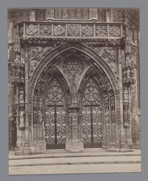 Curator: This is a photograph taken by Juan Laurent between 1856 and 1863, depicting the portal of the Santa Cruz la Real church in Segovia, Spain. It's a daguerreotype, now held at the Rijksmuseum. The photograph beautifully captures the intricate details of the stone carvings. What’s your immediate reaction to this piece? Editor: It evokes such a strong sense of the medieval, doesn’t it? The image feels heavy, almost weighed down by the sheer density of the carvings and figures around the entrance. The light emphasizes the depth and dimensionality of every little element of this portal. Curator: Absolutely. Laurent's choice to photograph architecture is fascinating. During this period, photography was starting to transform how Europeans documented and understood their built heritage. Photographs like this offered an unprecedented level of detail to those who couldn’t visit in person, democratizing access to architectural wonders. Editor: The Christian iconography is immediately apparent—the crucifixion at the top, the saints flanking the entrance. Given its placement over a doorway, do you think that this particular display of imagery might function as a spiritual invitation, or perhaps even a warning, for those about to enter? Curator: Indeed. Church portals are inherently liminal spaces, where the earthly and the divine meet. Consider, also, the politics involved in the display of that religious iconography, during the 19th century. How would the photograph have been received in a Europe undergoing secularization, yet still steeped in religious tradition? Editor: That’s a crucial point. The very act of meticulously capturing these religious symbols perhaps indicates a desire to preserve a vanishing cultural identity or ideal. Beyond the overt Christian imagery, I wonder what other, perhaps less visible, cultural memories this photograph might hold? What hidden meanings lie within the stone and light? Curator: The photograph is really a lens onto a society in transition, documenting both its artistic achievements and the changing values that shaped its perception. It reminds us of the public role architecture plays. Editor: For me, this photograph feels like a doorway not just into a physical space, but into a rich tapestry of cultural beliefs, hopes, and fears that resonate even today. It really gives you an idea of how much memory architecture embodies.