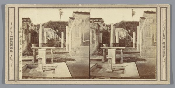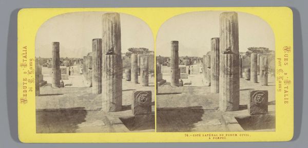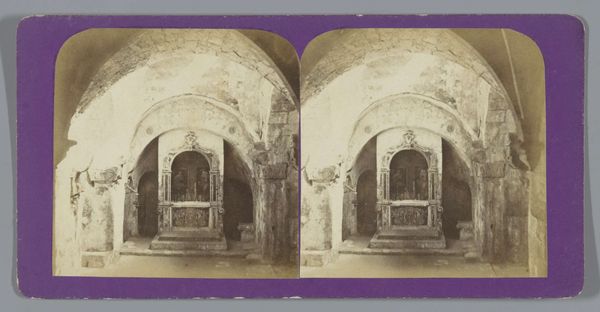 Editor: This gelatin-silver print from sometime between 1855 and 1868, titled "Zuilen in de crypte van de kapel van kasteel Cheb" by František Fridrich, it has a certain… solidity. The architecture is quite imposing. How do you interpret this work? Curator: Focusing on the formal aspects, the composition utilizes the repetitive verticality of the columns to establish a powerful sense of depth and architectural rhythm. Note the contrast between the rough texture of the stone and the intricate carvings. Editor: The carvings are quite ornate for what I imagine would be a simple crypt. What's the significance of this tension between the refined details and the rustic construction? Curator: It showcases the complex dialogue between structure and embellishment that typifies much medieval architecture. We could analyse the curves within the carved capitals to examine what, in structuralist terms, is being encoded or emphasized. Consider, for instance, the play of light and shadow. Editor: That contrast definitely gives it a sense of gravity. The gradations create so much depth. Are there other key aesthetic relationships worth looking for? Curator: The arrangement of forms creates what one might call a visual syntax, each element working in concert to evoke a particular experience for the viewer. Did this enhance your understanding of the visual presentation, despite not knowing its immediate historical context? Editor: I think so! Breaking down the picture into separate aspects highlights a more complicated dynamic than just surface level architecture. Curator: Indeed. These tangible details make for a very palpable historical impression.