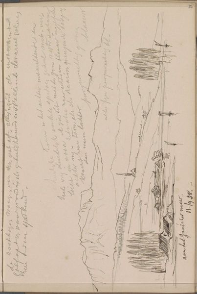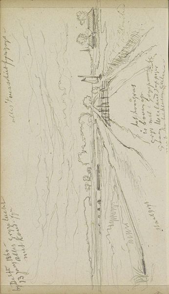 This is a landscape with farmland and a mill, by Johannes Tavenraat. The sepia ink drawing uses only line to bring the image to life. The composition guides the viewer through farmland to a distant windmill, but it is interrupted by a collection of frantic scribbles in the bottom left corner, which could either be notes, or abstract forms that provide an alternative to the pastoral scene beyond. Tavenraat’s use of line is striking. Notice how he uses the materiality of the ink and the fineness of the nib to create a sense of distance: up close the windmill is just a collection of hatched lines, but from afar it can be seen as a fully functioning machine. The flatness of the page is undermined by this suggestion of depth. Ultimately, this drawing, with its lines and semiotic codes, isn't just a visual record of a scene. It functions as a complex interplay between reality, representation, and the artist's perception.