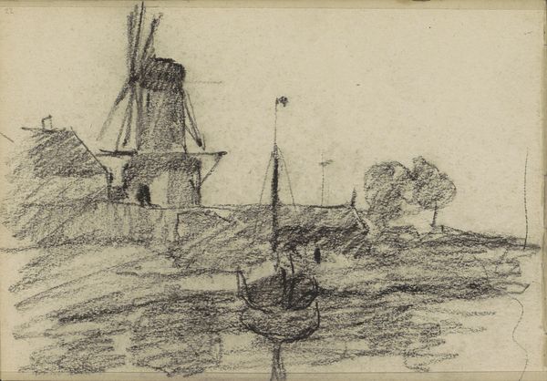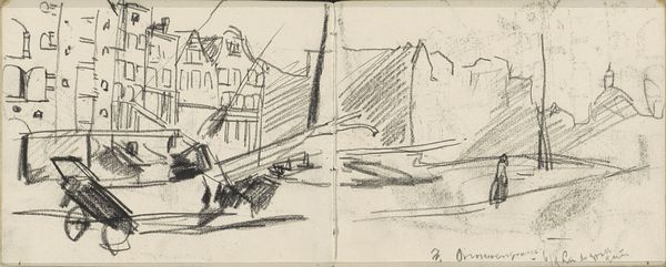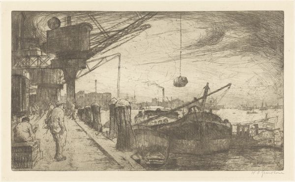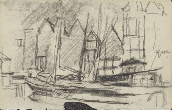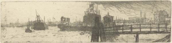 Editor: This etching, titled "Harbor at Burgstaaken," was created by Ernst Ludwig Kirchner in 1913. The jumbled lines and muted tones give the impression of a memory rather than a snapshot, kind of hazy, even. What stands out to you when you look at this piece? Curator: Hazy is the perfect word! Kirchner’s linework captures the raw, almost frantic energy of the Expressionist movement. Forget serene harbors—this is about feeling the harbor, the sharp angles, the restless movement of boats and water. It’s a visceral response, isn’t it? It’s almost like you can hear the seagulls squawking and the ropes creaking. I can almost smell the brine! Editor: Absolutely! There's a real sense of being right there. Are there any specific symbols he’s using? I can almost feel the chaotic jumble. Curator: Perhaps not literal symbols, but the fractured perspective itself is symbolic. Think of early 20th-century Germany, a society grappling with rapid change. Kirchner mirrors that fragmentation through the disorienting composition. The harbor, a place of coming and going, becomes a metaphor for the uncertainty of modern life. Editor: That makes sense! So it's not just a pretty picture of a harbor, but a reflection of the world at that time. A feeling in visual form! Curator: Precisely! And I wonder, how does that chaotic feeling sit with you? Do you find it disturbing, exhilarating, or maybe a little of both? Editor: I think it's exhilarating. It's messy, but there's energy in the mess, I hadn't thought about the historical background but this makes perfect sense, all thanks to you. Curator: And you helped me to see anew a piece that I’ve viewed many times! That’s the beauty of art, isn’t it? It sparks these conversations and unlocks different perspectives.
