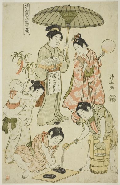Editor: This woodblock print, titled "The New Year's Festival, from the series 'Precious Children's Games of the Five Festivals,'" was created around 1801 by Torii Kiyonaga. It feels so light and airy! What stands out to you about this work? Curator: Well, consider the context. Ukiyo-e prints like this weren't "high art" initially. They were mass-produced, a commodity. What's fascinating is the labor involved, the carving of the woodblocks, the specific inks chosen, and the highly specialized process to produce color. Can you see how the arrangement and subject may reflect the consumption of festivals as leisure activity by urban audiences at the time? Editor: That's an interesting way to look at it! I was so focused on the children depicted that I didn't consider its consumer context. Does that influence your perception of this piece? Curator: Absolutely. This wasn't meant for a palace. This was for the burgeoning merchant class. Look closely at their clothes - how meticulously detailed each pattern, the richness of the colors; details meant to resonate with its original consumers. How the makers catered to this new type of art buyer and portrayed an aesthetic vision reflective of this market force interests me far more than a solely aesthetic experience. Editor: So, seeing it as a product of its time, for a specific consumer group, is key to its understanding? Curator: Precisely. It prompts questions about who made it, who consumed it, and how its very existence was shaped by the material conditions of 19th century Japan. These are very different factors when looking at the grand religious altarpieces or large family portraits! Editor: I’ve never thought about it like that before, I suppose considering material concerns helps frame it in relation to its social world. Curator: Indeed, and hopefully encourages all to examine more deeply how our perceptions about artistic value has shifted.