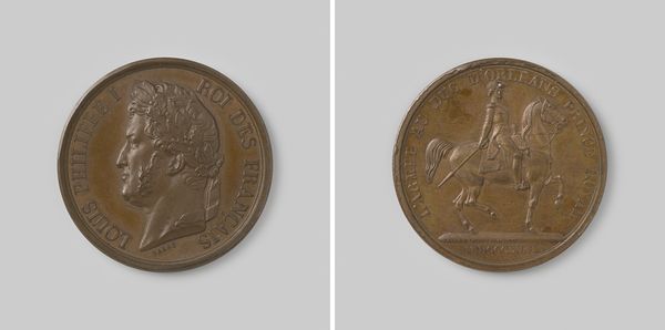 Editor: Here we have a bronze medal called "Inname van Kortrijk, Sint Winoksbergen en Mardijk" crafted between 1699 and 1703 by Jean Mauger. The Baroque style is pretty apparent. What strikes me is how it condenses historical events into this small object, like a time capsule. How do you interpret this work? Curator: Indeed. Medals such as these served as powerful symbols, miniature monuments circulating narratives of power. Note the inscription “LUDOVICUS XIIII REX CHRISTIANISSIMUS”. How does the term Christianissimus--Most Christian King-- strike you? Editor: It definitely infuses a sense of divinely sanctioned authority, as though his actions were blessed by God. Curator: Precisely. And turning to the other side, we see an allegorical figure, winged Victory. Victory wasn’t simply about military might; it signified divine favor, an endorsement of the King's righteousness. Observe what Victory carries, those symbolic objects, indicative of conquered territories. Can you infer what those symbols would mean to viewers in that time? Editor: Perhaps those symbols reassured the intended audience, but also reminded the defeated cities of their loss. Curator: Absolutely. Remember that medals functioned within a complex visual language. To fully decode them, we must understand not only the overt declarations, but also the subtle gestures encoded within. Editor: It’s amazing how much these compact artworks carry. Thank you for providing this framework of symbols. Curator: My pleasure. The imagery is fascinating, and I plan to study the medals further!