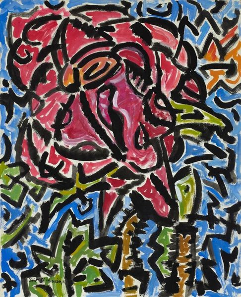 Curator: Looking at Vilen Barsky’s “Image,” completed in 1960, a portrait emerges through abstract strokes of ink and paint, a dance between figuration and pure expression. What’s your initial impression? Editor: Initially, the chaotic overlay of the dark lines projects a real sense of confinement—as though we're seeing the subject struggle against their own constraints. The way the colors peak out between the brushstrokes is beautiful though, offering subtle hints of character. Curator: It’s fascinating to consider the historical context. 1960 marked a period of intense social upheaval. Could this abstraction of form represent a disruption of traditional portraiture conventions reflecting broader societal changes and perhaps even anxieties around identity? Editor: I'm not sure that it is so literal. Rather than a mirror of societal change, perhaps we can look closely at the work's compositional elements. The texture itself conveys a deeper tension—the gray wash acting almost like a ground from which something organic pushes. Then look how the black linework actively refuses a cohesive shape. Curator: Exactly! And there are clear formalist choices. Note how he utilizes geometric shapes to create the likeness of a figure, using bold lines to define and distort simultaneously, and how this distortion allows viewers to interpret different emotions based on their own biases. How might the very abstraction here act as commentary? Editor: If we follow this abstraction further we start arriving at the core issue in semiotics, namely how meaning occurs within a given structure. Meaning occurs precisely because the abstract elements do not describe a being with direct reference to life, even as our minds immediately interpret them as "portrait". Curator: I find your insights, as always, deeply compelling. Analyzing art, particularly of this period, we risk the danger of flattening the discourse around individual agency, choice, and self-expression. How the personal informs and shapes artistic expression to challenge us, perhaps even, to embrace complexity and uncertainty in representation? Editor: But aren’t you flattening experience as well by making recourse to this historicism? By focusing intently on form and composition we allow ourselves an expanded sense of interpretative possibility beyond historicism, identity, or experience. What else do you see here? Curator: Perhaps this work encapsulates the complex struggle of articulating identity amid conflicting societal pressures. Thank you for drawing my attention to the artful struggle found even in the work's smallest, abstract structures. Editor: Thanks, I've enjoyed discovering these further resonances through dialogue.
