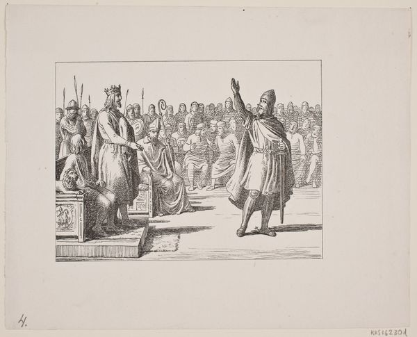 Bartolomeo Pinelli made this print of Gaius Popillius Laenas and Antiochus, using etching, sometime before 1835. Etching is an intaglio printmaking technique, meaning the lines are incised into a metal plate, and then filled with ink to make the image. Here, the etcher would have applied a waxy ground to the plate, then scratched away lines with a needle to expose the metal. The plate was then submerged in acid, which bit into the exposed lines, creating grooves. The depth and width of these grooves, and the amount of time spent drawing them, determines the thickness and darkness of the lines that define the composition. The finished plate would have been inked, wiped clean, and then pressed against paper, transferring the image. This process could be repeated many times, resulting in a series of identical prints. Etching was a particularly important technique because it allowed artists to create multiples, expanding the audience for their work. It also brings into question the status of printmaking as ‘high’ or ‘low’ art.