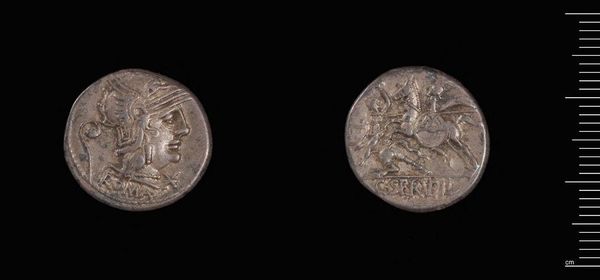 Curator: Isn’t it remarkable how much history can be held in something so small? This is a silver denarius, a Roman coin, made by L. Calpurnius Piso Frugi. Editor: The wear on it gives such an evocative feel, like holding a whisper from the past. It makes you wonder who clutched it tight, what markets it crossed. Curator: Absolutely. The process of minting these coins was quite deliberate, involving skilled laborers and carefully controlled metallurgy. The silver itself would have been sourced from mines across the Roman Republic. Editor: And the imagery! On one side, a noble head, perhaps a god or ancestor, radiating authority. The other, a figure riding at full tilt – a victory, or perhaps a memory, frozen in time. Curator: It speaks to the power of symbols, doesn't it? Each element, from the silver itself to the figures depicted, would have been carefully chosen to convey a message about Roman power and values. Editor: It is a gorgeous tangible link, isn't it? To think of it as both a work of art, and an object of labor, imbues it with such resonance.