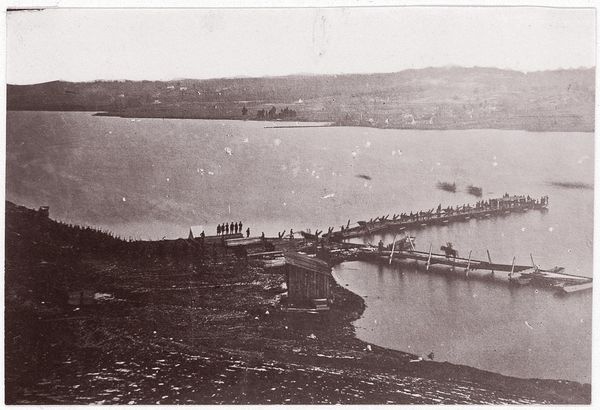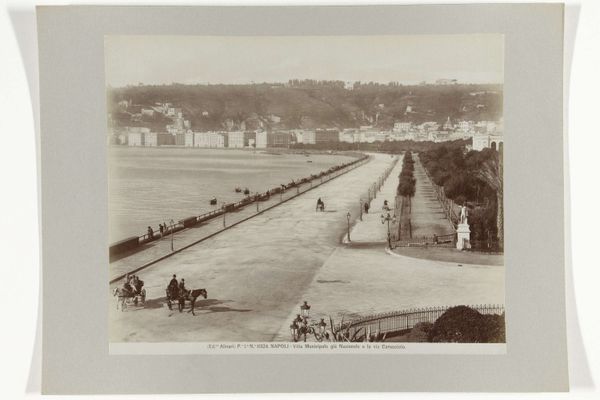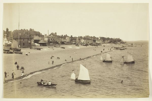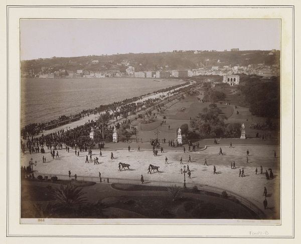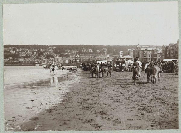 This photograph, ‘Gezicht op het strand van Dinard’ by Carl Norman & Co., presents a beach scene composed of many nuanced layers and textures in muted tones. Notice how the artist arranges the composition into distinct horizontal bands: beach huts in the foreground, a multitude of figures populating the sandy expanse, and then, in the distance, an elevated coastline topped with elaborate buildings. These layers create a sense of depth that pulls the viewer's eye across the scene. The repetition of vertical lines in the beach huts contrasts with the organic forms of the figures and the natural landscape. The photograph also captures a sense of social structure. The orderly arrangement of beach huts suggests a controlled environment, contrasting with the lively chaos of people enjoying the beach. This tension underscores the complexities inherent in representing social spaces, reflecting an engagement with the structuralist notion of underlying systems that govern our understanding of the world. Ultimately, this photograph invites us to consider the interplay of structure and chaos, order and freedom, as visualized through the careful arrangement of form and space.