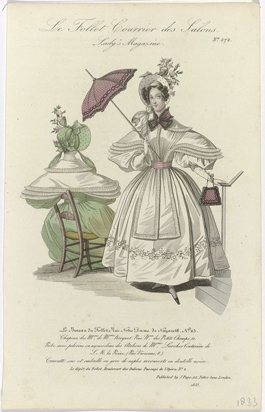 Curator: Here we have an etching from 1833, titled "La Mode, 20 avril 1833, Pl. 296: Coiffure de M. Victor Plaisir." It comes from Jean-Denis Nargeot. What catches your eye? Editor: Definitely the color, this gentle pink—it feels strangely delicate, almost like a faded dream of extravagance. It's also a little overwhelming. All those bows! Curator: The bows could signify more than mere decoration. In that era, adornments were potent signifiers of social status and even availability. The placement—descending down the dress—could subtly represent a path or journey, almost a story told through material symbols. Editor: Interesting point. I was thinking more about the process, how this etching allowed for mass dissemination of fashion trends. You see how precisely rendered the lace is; it was meant to inspire emulation and drive consumption, I suspect. What kind of labor would have gone into replicating that lace collar? Curator: Undoubtedly skilled labor, adding to the aspirational quality of the print. Notice how the figure's coiffure, specified in the title, isn't merely a hairstyle; it's an engineered aesthetic, an edifice practically. Editor: It's wild! And all that to participate in the performance of being fashionable. This image serves as a record of trends, a material document encoding social expectations, almost forcing these women into constrained molds— literal and figurative! Curator: Perhaps the bows themselves function dually, both as decorative enhancement and subtle constraints, cinching the wearer into a particular aesthetic framework... an appealing paradox. Editor: I hadn't thought of it that way. Thinking of it as 'cinching' really puts the fashion in its social and material place for me. Curator: Indeed. The print provides insight into an aesthetic, a moment, and perhaps most importantly, the enduring power of imagery to shape aspirations and social norms. Editor: Right. The work of reproducing these standards by hand, though! The human element, churning and pushing and pulling on material in the service of the decorative. Fascinating.