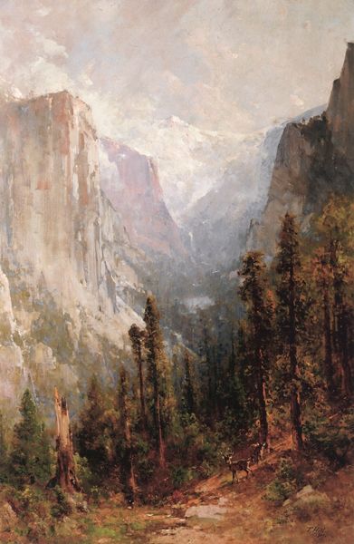 Thomas Hill, probably in the late 19th century, created this landscape using oil paint on canvas. These were fairly conventional materials for painting at the time, produced industrially and sold widely. The material itself – oil paint – lends the scene its characteristic hazy quality. You can almost feel the sunlight diffusing across the valley. Hill applied the paint in layers, building up the image gradually. The canvas support also plays a role, its texture subtly influencing the final surface. The scale is also relevant; a painting like this was made for display, intended to impress viewers with the sublimity of the American West. But it is the subject matter that is really critical here. This vista, already a popular tourist destination in Hill's time, is also depicted as a site of indigenous presence, and indeed their displacement. The Piute people are literally in the landscape, but also being pushed out of it, as their ancestral lands were commodified and consumed by others. Materials, making, and context – all crucial to understanding the full story.