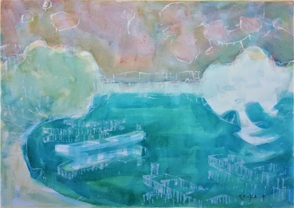 Alice Rahon’s ‘Next Morning’ is an oil on canvas artwork, and feels like peering into a dream. The paint is applied in thin layers, creating this luminous, watery atmosphere, where everything seems to float and shimmer. Look at the way the blues and greens blend, almost like watercolour, and how the forms of buildings and trees emerge from this misty space. There’s a real sense of looking at something just beyond our grasp, something remembered or imagined. I’m drawn to that cluster of small trees near the bottom - tiny vertical marks that feel so fragile and exposed against the vastness of the scene. They remind me of Cy Twombly's work, where simple gestures create such a powerful sense of space and emotion. Rahon’s painting invites us to embrace ambiguity, to let go of our need for clear answers, and to simply revel in the beauty and mystery of the unknown.