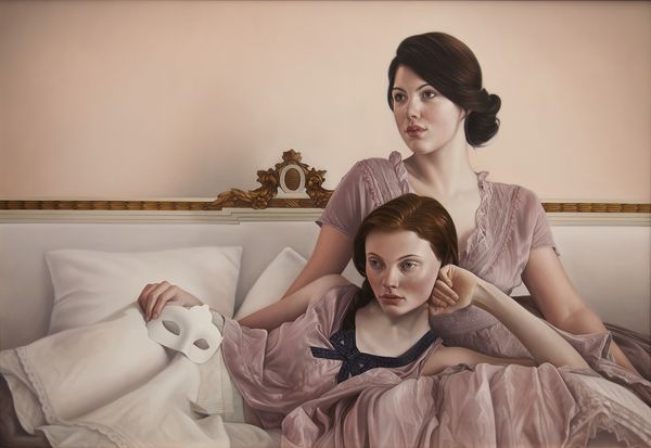 Editor: Here we have James Tissot’s “Comtesse d’Yanville and Her Four Children,” painted around 1895. What strikes me is the almost ethereal glow to the mother’s dress, contrasting with the very present gaze of the children. It's beautiful, but what's your take? Curator: Beautiful, yes, but also subtly…off. Don’t you feel it? Tissot, ever the social observer, has captured something beyond just a pretty picture. It's the late 19th century, remember – social expectations for women were intensely focused on domesticity, motherhood. Editor: Right, so is this a comment on that? Curator: Perhaps a quiet one. Look at the Comtesse. She's elegant, poised, almost statuesque. But also, distant? Is she truly *present* with her children? Or performing the role of 'mother'? The artist makes great use of composition with each figure almost separated from the others. It’s not overt criticism, mind you, Tissot was a commercial artist, a painter of modern life. But that subtle unease... Editor: That makes sense. So, the ornate chair, the meticulously rendered fabrics…they're not just about showing off wealth? Curator: Oh, they are, of course. But think about what those things represent: confinement, restriction. Think of how her fashion restricts movement; that whalebone corset! And consider her gaze – knowing, resigned perhaps? Does she see her daughters going down a similar path? I do wonder if they all want something beyond the gilt cage! What do you think? Editor: I definitely see that disconnect now. It's like the painting is whispering secrets about the complexities beneath the surface. It really makes you think about the limited options these women had. Curator: Exactly. Art doesn’t have to scream to make a statement, does it?