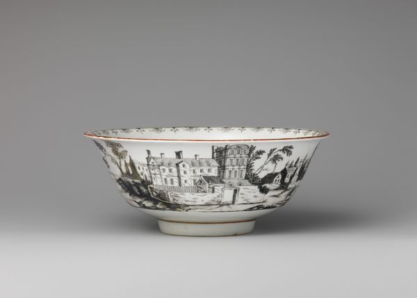 Editor: This lovely piece is called "Kwispedoor, beschilderd met een rivierlandschap met ruïne," dating back to around 1774-1778 and created in Loosdrecht. It's earthenware with a drawing, depicting a landscape. It's such a quaint, almost idyllic scene on such a small scale. What draws your eye in this piece? Curator: Well, firstly, it’s the audacity of placing this elaborate river scene, complete with a crumbling ruin – talk about melancholy chic! – onto something as prosaic as… well, a spittoon. Can you imagine? All this rustic romanticism meant for expectorating into! That juxtaposition of high art and, shall we say, bodily function… it tickles me. Editor: I hadn't even thought about it being a spittoon. A bit gross, yes, but also incredibly funny now that you mention it! Is it trying to elevate the mundane or make art accessible in daily life, perhaps? Curator: Precisely! The 18th century was obsessed with this kind of whimsical blurring of boundaries. Also, notice the brown monochrome palette and miniature scale – it evokes the intimacy of a personal keepsake, like a precious memory turned into a vessel for… well, you know. Maybe, it’s less about elevation and more about integration: weaving beauty into every nook of existence, no matter how humble. Editor: It makes me wonder about the owner of such an object. It feels so intimate and yet so... public, almost performative in its design. I love that. Curator: A perfect snapshot of the era, really. This piece makes you wonder about the secret stories whispered into riverbanks, then finding themselves spat into a porcelain landscape. Art can find its way to unexpected places! Editor: I never would have seen the humour without you pointing it out. Thanks!