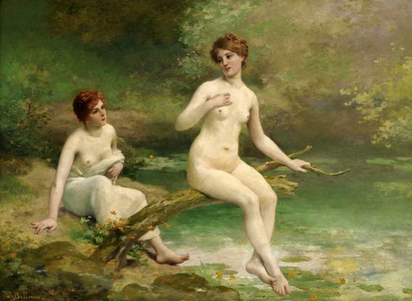 Luc-Olivier Merson made "La Vérité" using oil paint, a material that allows for a smooth, almost photographic finish. Look closely, and you'll see how the paint is layered to create depth, especially in the figures and foliage. The artist's choice of oil is significant; it was a medium favored by the academy, ideal for rendering the textures and colors of the scene. The smoothness of the finish is interesting, especially given the theme of truth. Merson seems less interested in a rough, immediate expression and more interested in a classical ideal. This makes the work a great example of academic painting, which often prioritized technical skill and established conventions over radical experimentation. The labor involved is considerable, especially given the scale and detail of the piece. Ultimately, this painting invites us to think about the ways that materials and making processes can influence our perception of truth itself. Is the truth smooth and polished, or something more raw and immediate?