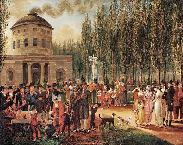 Curator: What strikes me immediately is the theatricality. Editor: Indeed. We're looking at Jean Leon Gerome Ferris's "General Washington at Christ Church, Easter Sunday, 1795," painted in 1908. It's a carefully staged history painting, rendered in oil paint, designed to evoke a specific narrative. Curator: The composition reinforces that narrative, doesn't it? Washington is the clear focal point, illuminated against the backdrop of the church. His figure occupies a central position in a pyramidal shape created by the other figures who flank and turn to him, leading the eye directly to him, underscoring his significance and emphasizing ideal leadership. Editor: Quite. And what intrigues me are the implied details of the work’s commission, its likely consumption via mass reproduction. The original may appear singular, but its impact depended on the material processes that replicated and distributed its message about civic virtue. Note, for example, how everyone's garments denote meticulous labor. Curator: I concede that, from a symbolic perspective, the garments and presentation do help craft the illusion of the time. What I can't move past, however, are the contrasting surfaces and textures that build a pictorial depth and lend this painting much of its allure. Observe how the horses pull this ornate gilded stage behind them. This painting could simply serve to immortalize General Washington as an upstanding individual for years to come. Editor: The sheen of the carriage does hint at a kind of nationalistic project through depictions of labor, wouldn't you agree? The artisan's craft is here juxtaposed with the more painterly strokes of trees that stand behind. There are subtle gradations of tone. One can wonder whether or not such detailing might serve to sanctify early America's more elite citizens to the exclusion of the many who remained poor during this era? Curator: A compelling idea! This approach casts "General Washington at Christ Church" in a dramatically different light than, say, one that dwells on the symbolic potential of the figures, architectural planes, or interplay between light and shadow alone. Editor: Indeed, a study of the painting's making draws focus to the ways history can often serve a certain narrative or ideal for future generations.
