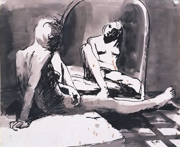 Curator: Immediately, there’s a wistful longing, don’t you think? Like a melancholy poem about to be written. Editor: Perhaps! What grabs me right away about this artwork is the dreamlike, almost ethereal quality. This portrait, simply called "Untitled" as it happens, is an ink drawing by Jean Cocteau. The spare use of line really focuses my eye. Curator: Yes, Cocteau, of course! It's just brimming with his distinctive flair—that elegant line, the poetic simplicity. The figure almost floats against the soft, atmospheric background, hinting at the mythic and timeless. And I am so interested in the motif of rebirth and transformation, evident in the tiny branch he holds—the figure's quiet expectation as a bridge into some other world. Editor: That budding branch in the figure’s hand carries the weight of Persephone’s pomegranate! Consider the broader cultural weight. In that gaze heavenward and gesture there’s a sense of offering or supplication that appears often, from antiquity to the Romantics. Even his hair tied up into a scarf around his head is reminiscent of sculptures and iconography around Alexander the Great. Curator: Absolutely! Cocteau was obsessed with classical mythology, you know. But there's something so uniquely Cocteau in the androgyny. This feels like a symbolic self-portrait; he so often explored themes of duality and transformation within himself, right? A glimpse into his artistic soul! He captured a timeless sense of vulnerable beauty. Editor: I agree that the ambiguity of the figure contributes to the piece's power and depth. By not clearly defining gender, the artwork touches on universal themes of identity and self-discovery that are perennially fascinating. Also, to add an emotional weight to it, think about that horizon at sea, like an implied background. Is that Ithaca far in the distance for Odysseus or is that another horizon to be crossed for someone starting from the ashes? It's a feeling for home that transcends time itself, especially for migrants. Curator: It speaks, doesn't it? A beautiful, delicate echo in our collective artistic memory. Editor: I suppose there’s nothing "Untitled" about what it all makes us feel.