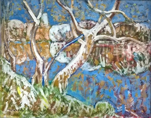 Curator: Here we have "Molecules," a mixed-media artwork by Alfred Freddy Krupa, created in 2016. What are your initial impressions? Editor: It feels chaotic, almost violently cheerful! The colours are playful, but the composition is... restless. It's like looking at an exploded diagram of some kind of oddball machine. Curator: Krupa’s work often grapples with the legacies of expressionism and geometric abstraction. The vigorous application of acrylic paint and what looks like matter-painting certainly nods to those movements. Editor: Matter-painting! Yes, I see that. The texture gives it such an unruly energy. And 'Molecules' as a title... does that tame it at all? Or is it just adding another layer of bewilderment? Curator: Perhaps both. The title alludes to scientific structures while the abstract style rejects literal representation. It’s this tension that’s key. Abstraction became prominent after WWII, in part as a rejection of overtly propagandistic art. How can art address the most complex scientific ideas of our time and not be reduced to propaganda? Editor: Right. And with this particular artwork it becomes like peering into a petri dish gone wild. The juxtaposition of rough textures with those hard geometric elements reminds me that everything, even science, is rooted in something human and messy. Curator: That interplay of control and chaos, perhaps reflective of societal attitudes towards science and technology during the 21st century, and especially the possibilities for good, but the potential for great harm. Editor: Absolutely. Seeing those playful colours smeared onto a rough surface kind of shakes loose any illusions about scientific objectivity. You know? Makes me question all our neatly drawn diagrams and equations. It is almost like the feeling after someone has said too much and left too quickly. Curator: The expressionistic gestures give that away. This has been a rather atomic journey! Any final reflections? Editor: I walked in and the first thing I saw was this unholy mess, and I can appreciate its reflection in how we cope, not necessarily come together. Curator: The piece indeed holds multitudes and offers a reflection of human nature under a magnifying glass.