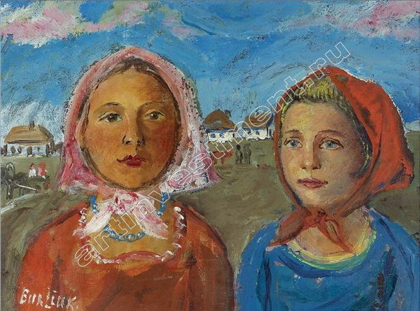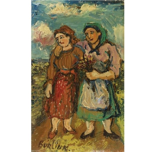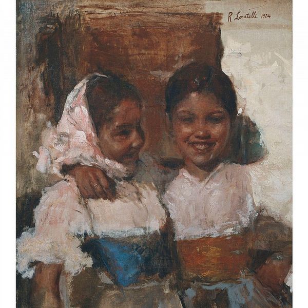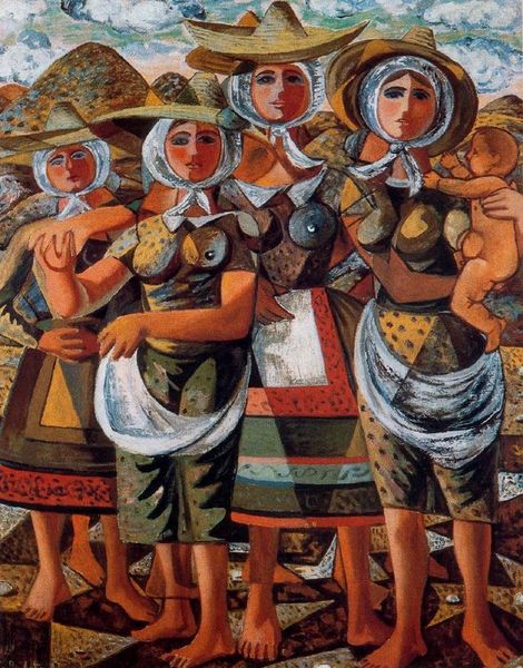 Editor: We are looking at "Two Sisters," painted in 1915 by Camil Ressu. The texture of the oil paint on canvas is quite apparent. There's something very solemn about the figures, standing so close yet seeming disconnected. What do you see in this piece from a formalist perspective? Curator: The composition is strikingly symmetrical, dividing the canvas nearly in half with the two figures. Note the verticality—it's echoed in the tree trunk, and their bodies, contributing to the static, almost monumental quality. Consider the contrast of color: the muted earth tones against the softer, diffused palette of the landscape. Editor: Yes, the earthy colors against the pale landscape are intriguing. There’s a tension there. Are there any significant formal relationships you notice in the work? Curator: The limited color palette works to unite the composition. Ressu uses a repetitive circularity, you see it in the headscarves and reiterated, though more abstractly, in the background foliage, creating a subtle rhythm. It's a restrained harmony. How do you perceive the use of line? Editor: I hadn't noticed the repetition of the circular shapes. As for the lines, they seem quite deliberate, defining forms but not particularly sharp, softened somewhat. Almost naive perhaps? Curator: The subdued line quality is crucial. Ressu is clearly interested in flattening the picture plane. There is a deliberate move away from Renaissance depth. Consider what effect is produced by the reduced sense of volume. Editor: The flatness does make them seem more symbolic, less like specific individuals. This has certainly altered how I view Ressu’s formal choices and understand how it creates the symbolic feel of the painting. Curator: Exactly, through rigorous arrangement of form, line, color, and plane Ressu elevates the scene. These formal qualities contribute greatly to its powerful effect.