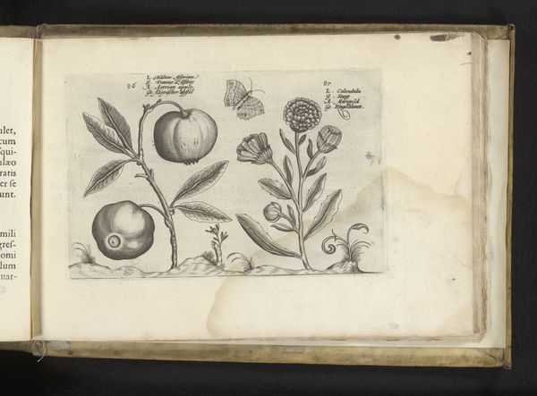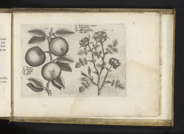 Curator: Look at this beautiful botanical illustration, "March Violet and Orange," dating back to 1617 by Crispijn van de Passe. It's housed here at the Rijksmuseum. The artist used etching with ink on paper. What strikes you first? Editor: The stark contrast – it's very minimal and subdued, the paper has a wonderfully aged look. It gives a feeling of something captured perfectly. Almost like seeing a quiet corner of an apothecary's garden. Curator: Definitely. I feel the illustration's positioning within the book form is also important. I wonder what was intended by having these images appear to grow on top of printed words? It creates a space where the literary, scientific, and natural intertwine. Editor: The juxtaposition definitely sparks ideas around how nature writing at the time played a vital role in shaping understanding of the natural world and the violet specifically. Violets carried so much symbolic weight at that time. The modesty, faithfulness, remembrance—these flowers often signaled much deeper messages. Curator: Right. And that orange on the other side—such a luxury item then. It hints at wealth and trade, the exotic becoming more accessible. But the rendering isn't about flawless representation, but something… studied. He focuses on the small details of the flower petals and then just alludes to the fruit shape. Editor: I think the style reflects something that is quite inherently gendered. Botanical drawings such as this became avenues through which many elite women of the era developed as artists. Looking back now, there is such potential here to read the making of prints such as these as part of women's ongoing work towards greater self expression. Curator: Absolutely, that makes so much sense in this context. What starts out looking like something purely representational, like a factual plate for a botanist's guide, unfolds to be deeply layered, connected to personal lives and broader cultural currents. Editor: Precisely! And for me, reflecting on the artist, Crispijn van de Passe, prompts me to ask what this era looked like for women within the artist's circle, and within the artworld more generally. Curator: I'm so glad you touched upon that; food for thought. This seemingly simple rendering has shown us the value in quiet examination and intersectional thinking. Editor: Indeed. This book becomes an interesting source of thinking about Renaissance-era culture as bound to matters of gender and power.