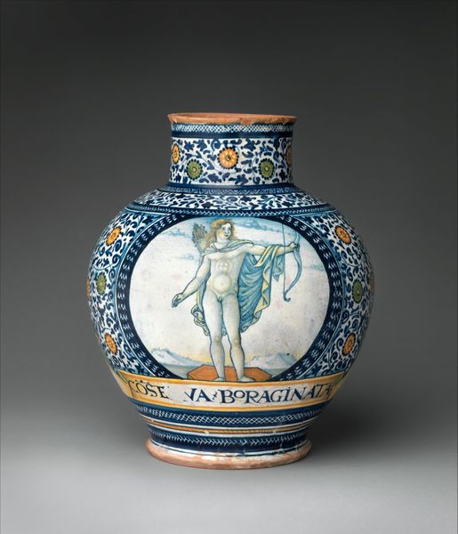 Curator: Let’s discuss this fascinating piece of Italian Renaissance decorative art: a globular vase, believed to be crafted sometime between 1585 and 1599. Editor: It has an arresting presence; the glazing provides a striking sheen. I sense both opulence and solemnity. What statement was it trying to make? Curator: Formally, observe how the vase’s structure balances utility with aesthetics. The rounded body flares to a narrow neck, perfectly accommodating floral and vegetal decorative motifs, interspersed with figurative emblems. The main escutcheon containing a standing saint creates the artwork’s main subject. Editor: A religious figure takes centre stage within a series of ornamental borders; but it must be positioned inside a broader visual culture. Given the rise of powerful merchant families during the Renaissance and their desire for religious displays inside their household environments, the vase would’ve appealed as an accoutrement to Renaissance ideals of domestic display. Curator: Quite so. The color palette itself is very interesting: contrasting earthy ochres and cobalt blues with dashes of emerald green. Also, consider the intricate brushwork – note how the delicate rendering animates the figure’s beard and facial features. Editor: Indeed, there is a distinct devotional tenor at play. I am thinking of the many confraternities and religious groups that sprang up across Europe at the time. Did it commission? Curator: It's highly plausible; this wasn’t an exceptional object only due to its surface decoration, it must also be evaluated regarding patronage and production. Editor: Considering all of that, perhaps, in examining the vase, we are also deciphering clues related to status, faith and allegiance in Renaissance Italy. Curator: It leaves much to ponder indeed—its technical refinement, composition, and social-historical relevance are of notable significance. Editor: Yes, it is clear that the convergence of artistic excellence, cultural narrative, and historical agency combine into a powerful expression.