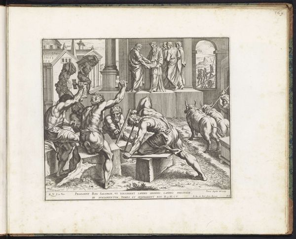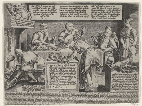 This anonymous engraving, titled 'De Rede maant de kerken tot verdraagzaamheid', presents a densely populated composition of figures engaged in various activities. The artist uses a consistent, detailed line work to define forms, creating a tableau that invites close scrutiny. The arrangement of characters around a central table creates a sense of organized chaos. The eye is drawn to the interplay of gestures and expressions which suggest narrative depth. Each figure seems caught in a moment of reflection or action, contributing to the overall symbolic weight of the scene. The text integrated within the image acts as a semiotic device, layering meaning onto the visual elements. This interplay between text and image challenges a singular interpretation. Does it reinforce or destabilize the scene's intended message? Ultimately, it is the formal structure of this engraving that enables the exploration of tolerance and understanding.