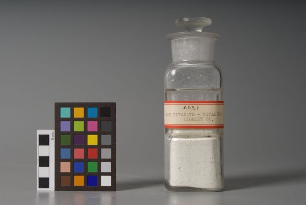 Curator: Here we have "Synthetic Venetian Red," produced by F. Weber & Company, Inc., around 1942, I believe. What a striking, earthy tone! Editor: It certainly feels very contained, doesn't it? In that little bottle. The fact that it’s synthetic, mass-produced during wartime, adds layers of meaning to its color and symbolic power. Curator: Absolutely. Consider the historical weight of red. From ancient cave paintings to Renaissance masterpieces, this specific Venetian hue has always signified power, passion, even sacrifice. Here, though, it feels...domesticated. Editor: Or perhaps, commodified. Its synthesis removes it from the earth, from its organic origins. What does it mean when such a potent color is so readily available? I wonder about the implications for artistic expression and cultural value. Curator: I hadn’t thought of it that way, but it's true—the ease of access does shift its symbolic weight. The little star on the bottle complicates my response. Editor: I think the star is quite interesting, actually. Perhaps the star is used to mark its importance or its value to the artist? Curator: Yes, there is much to contemplate. Thank you for sharing your thoughts. Editor: And thank you for your insight into the historical resonance of this Venetian Red.