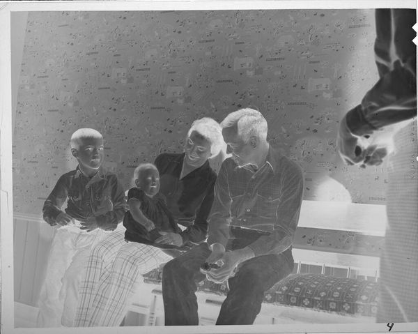 Editor: This is an untitled black and white photograph by Lucian and Mary Brown, of a woman and children around a piano. It feels intimate, like a snapshot of everyday life. What do you see in it? Curator: It's got that lovely, slightly faded quality of old photos, doesn’t it? For me, it's a story frozen in time. A family gathered around the piano is universal, instantly bringing a sense of nostalgia for simpler times. But do you notice anything unusual? It's like looking at a photographic negative. Perhaps it suggests we are seeing not just the present, but also hints of what has already passed, the unseen layers of memory itself. Editor: That’s interesting. Thanks, I hadn't thought of that. Curator: My pleasure, now when I look at it, it sings to me.
