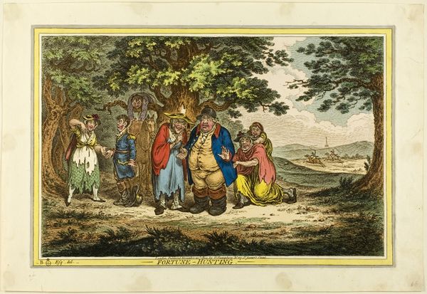 Curator: So, here we have William Brocas's "Les Invisibles," or "The Invisible Ones," a colored pencil drawing created around 1810. It presents a group of figures outdoors. My initial impression is that it feels very crowded, a bit satirical. The faces are almost completely obscured by elaborate hats and clothing. Editor: I would certainly agree with that assessment. One reads these caricatures through the lens of fashion and social satire from the early 19th century, with class hierarchies dictating extreme displays of wealth. How do the upper classes assert their status when the Revolution theoretically espouses equality? Through exaggerated, ridiculous displays. Curator: Exactly! These "invisibles," shrouded in finery, paradoxically make themselves conspicuous targets of ridicule. It also brings up ideas around the construction of public persona during this period, in a moment in which social mobility began to affect all European social classes. We tend to think of personal display of status as a modern phenomenon, but these ideas clearly reach much deeper in history. Editor: Look at the exaggerated shapes and gestures: The way they tilt their heads, the excessive frills on their bonnets, the elaborate military attire on one of the male figures. The coloring is very striking too, an almost pastel palette to accentuate the ridiculousness through contrast. It's a comedy of surfaces! It mocks a culture obsessed with superficiality. Curator: Right. One sees the print tradition emerging at this period and its contribution to cultural and political discourse. Prints, like "Les Invisibles," democratized caricature and allowed ideas around identity and political discontent to circulate among various publics, whether within social strata or through pamphlets on the street. What's funny, what isn't? Editor: What I find interesting is the suggestion of absence, despite the detail rendered in costume and decoration. By visually obscuring the faces, Brocas almost proposes that identity becomes subsumed by performance. In the absence of an authentic self, only roles and clothes persist. Curator: So in our present world of carefully cultivated online profiles and curated personal brands, perhaps “Les Invisibles” still speaks to anxieties about authenticity, albeit dressed in period garb! Editor: Indeed! It would appear so. Even today, identity often dissolves into image, perhaps making Brocas's commentary evergreen.