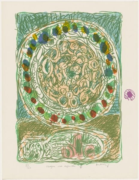 Editor: This is Andre Masson’s “Illustration for ‘Mines de rien’ by Robert Desnos,” a 1960 print. The composition strikes me as a vibrant push and pull of color and shapes, almost like coded language. How do you interpret this work, especially given its surrealist style? Curator: This piece, made fourteen years after Desnos' death in a concentration camp, speaks volumes about memory, trauma, and artistic resistance. Masson, deeply rooted in Surrealism, utilizes the automatism and organic forms you see to channel the subconscious, a realm deeply affected by war and political upheaval. Can you see how the ostensibly abstract forms might suggest buried anxieties and the fragmented nature of memory following profound loss? Editor: I see how the broken shapes and chaotic arrangement could reflect that fragmentation. Were Masson and Desnos responding to something specific in their historical moment? Curator: Absolutely. The post-war period was a time of immense reckoning. Surrealists grappled with the failures of reason that led to the war, using art as a tool for psychological and social liberation. In that regard, what’s your perspective on the choice of a black background to emphasize those organic forms? Editor: It definitely makes the colors pop, but it also feels a little claustrophobic. It suggests this internal, perhaps even repressed, space. Curator: Precisely. It evokes the darkness of the unconscious, perhaps hinting at the unspeakable traumas of the war. Masson's surrealist language, intertwined with Desnos' poetry, serves not just as an aesthetic expression but as a powerful political statement, reflecting the collective grief and search for meaning. Editor: This makes me look at abstract art in a different light. It's more than just aesthetics; it's history, politics, and memory all rolled into one. Curator: Indeed. This piece beautifully demonstrates how art can function as both a mirror and a means of confronting difficult truths.