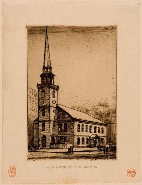 Editor: This is Otto Frederick Langmann’s drawing of the Park Street Church in Boston. I'm struck by its almost ethereal quality, despite being a rendering of a very solid, established institution. What stories does this drawing tell you about the city and the people within it? Curator: This seemingly simple architectural study is ripe with social context. Church steeples often dominated skylines, representing not just religious authority, but also power structures within the community. Consider who had access to these spaces, and whose stories were centered versus marginalized. Langmann’s choice to depict this church invites us to question its role in shaping Boston's social fabric. Editor: That makes me think about the figures at the base and who is included and excluded. Thanks for sharing that perspective! Curator: Of course. Thinking about art this way invites us to look critically at the world.