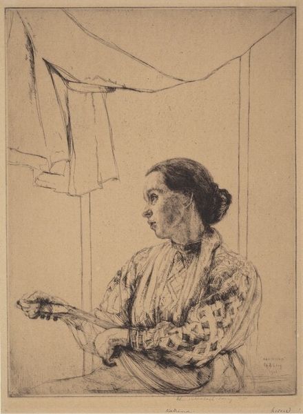 Lovis Corinth made this etching, Woman with Needlework, with simple lines that feel both raw and intimate. It’s like seeing the world through his eyes, a world where process matters more than perfection. The texture here is all in the lines, a web of cross-hatching that builds up the form. The lines aren’t precious; they’re there to describe a kind of reality. Look at the face, how the lines around the eyes and mouth suggest a life lived, a story etched onto the skin. It reminds me of some of Käthe Kollwitz's prints, where the line carries both form and emotional weight. It’s this honesty, this embrace of the imperfect, that really grabs me. It’s like Corinth is saying, "Here it is, life as I see it, flaws and all." And in that, there’s a strange kind of beauty.