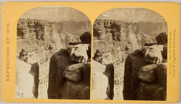 Editor: This is William Bell's "Northern Wall of the Grand Cañon," a stereograph from 1872. The figure perched on the edge makes me think about manifest destiny, about the drive to conquer and map the American West. What do you see in this piece? Curator: It’s interesting that you mention manifest destiny. Consider how these images, produced during government-funded expeditions, were used to assert dominance over the landscape and its Indigenous peoples. How does the lone figure contribute to this narrative? Editor: I guess the figure emphasizes a supposed triumph of man over nature, which is troubling. Curator: Exactly. The very act of photographing and distributing these images played a role in shaping public perception and justifying colonial expansion. Recognizing this helps us understand the complex relationship between art, power, and history. Editor: That provides a new lens for appreciating the photograph's importance. Curator: Indeed. By understanding its historical context, we can view this image as more than just a landscape; it becomes a visual document of a complex and often problematic history.