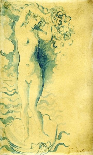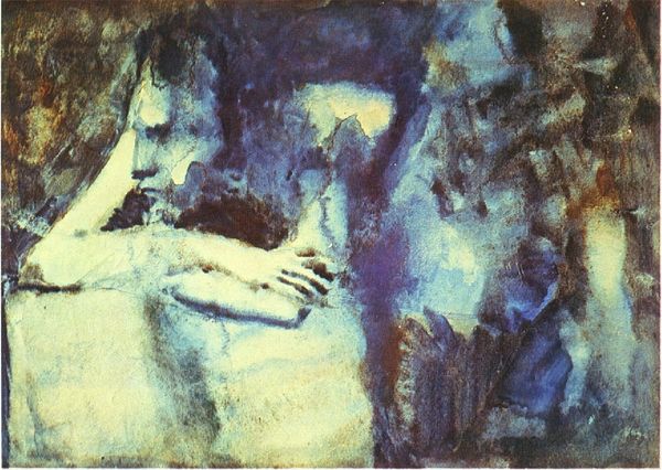 Pablo Picasso created this artwork, "Two Friends," using watercolor at an unknown date. The composition features two female figures, one reclining on a bed and the other standing, rendered in delicate washes of color that create a dreamlike atmosphere. The subtle use of blues, yellows, and browns, combined with the flowing lines, evokes a sense of melancholy and introspection. Picasso's choice of watercolor allows for a certain fluidity, where forms dissolve into one another, destabilizing the conventional boundaries between figure and ground. The reclining figure's languid pose contrasts with the upright stance of the other, creating a dynamic tension. This contrast can be interpreted through the lens of semiotics, with the body language and spatial arrangement serving as signs that communicate complex emotional states and relational dynamics. The ambiguity of the setting, combined with the ethereal quality of the watercolor, challenges fixed meanings. The artwork functions as a space for ongoing interpretation, where each viewer brings their own associations and understandings to the interplay of form, color, and composition.