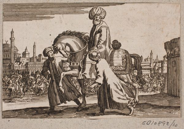 This small, undated engraving shows a Turkish rider followed by three servants on foot. The conical hats worn by the servants, also known as "hennin," symbolize status and affiliation, harking back to ancient cultures where headwear signified social rank. The horse, a recurring motif throughout art history, embodies power and nobility, its rearing stance evoking dynamic energy. Consider how equestrian statues of Roman emperors, like Marcus Aurelius, served as potent symbols of imperial authority, a tradition echoed in Renaissance art. These symbols, like the horse, are vessels of cultural memory, carrying with them a rich history of power dynamics and social hierarchies. The East has always been a mysterious place, full of exoticism and luxury for the West. The Ottoman Empire was at the peak of its powers and its image inspired awe and dread, engaging viewers on a deep, subconscious level. These recurring motifs are not static; they evolve, resurface, and take on new meanings in different historical contexts, their emotional resonance a testament to our collective cultural memory.
