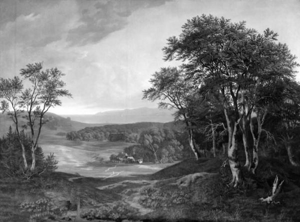 Curator: I’m drawn to the chiaroscuro; it gives the whole scene such a somber, reflective mood. Editor: Agreed. There is a deep stillness here. What is it? Curator: We're looking at Heinrich Buntzen's "Skovrigt landskab," completed in 1839. A rather muted landscape rendered in oil. What’s interesting to me is how seemingly mundane pastoral scenes in art reflect collective values around nature, homeland and identity during periods of social change. Here, the dark shades evoke introspection—an element of Romanticism looking inward as cultures faced modernization. Editor: It’s striking how the paint itself has aged. You can see the weave of the canvas. I wonder about Buntzen’s brushstrokes—were they deliberately creating that texture, or is it merely the passage of time playing tricks? The materiality almost pulls me into another era—a material record that is altered and marked, and becomes more telling across time. Curator: The symbols here tap into the subconscious too, especially when understood alongside the values of his time. Those skeletal, leafless branches—a classic memento mori, or symbolic meditation on mortality, which often indicates a desire to transcend material reality. And the dramatic clouds…very Romantic! Nature being powerful and humbling forces you to confront bigger existential questions. Editor: Right. And to consider this 'powerful nature,' think about how much labor went into even sourcing these raw materials for paints in 1839? Each pigment was sourced, mixed—a whole industry enabling even simple landscapes. And for whom was this vision created? Was this countryside for everyone, or did its accessibility fall sharply along class lines? These idyllic scenes often mask complex labor and power dynamics. Curator: Interesting question, because that very idea of idyllic life was used ideologically at times—artists often served the needs of wealthy patrons, which colors our reading today. So this particular monochrome treatment emphasizes themes that spoke to bourgeois anxieties about time and being in the world, in an accessible visual form. Editor: Yes! Well, now when I look at the painting’s surface again I cannot but wonder: What would Buntzen think of what this oil painting, as a physical object and artwork, reveals today? It certainly provokes unexpected questions regarding access, social messaging, materiality, labor, time…! Curator: Exactly! A lot more than initially meets the eye…