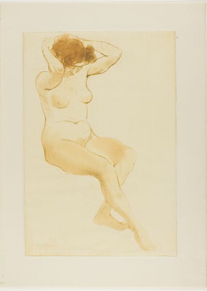 Thomas Wilmer Dewing created this Nude Study using pastel on paper. The figure emerges ethereally from a warm, brown background. Notice how Dewing uses delicate lines and subtle gradations of color, predominantly yellows and pinks, to model the form. This softness lends the figure an almost dreamlike quality. Dewing was interested in capturing idealized beauty, rather than anatomical accuracy. The figure is not a realistic portrayal of the human form but an evocation of feminine grace. Her elongated limbs and gentle curves suggest a harmonious balance, aligning with the aesthetic movement's emphasis on beauty for its own sake. The composition lacks a defined setting, directing our attention solely to the figure's form and posture. Consider how the artist balances the lines and mass of the figure with the surrounding space, creating a sense of equilibrium and understated elegance. It is through this focus on form and composition that the drawing transcends a mere study and becomes an exploration of aesthetic ideals.